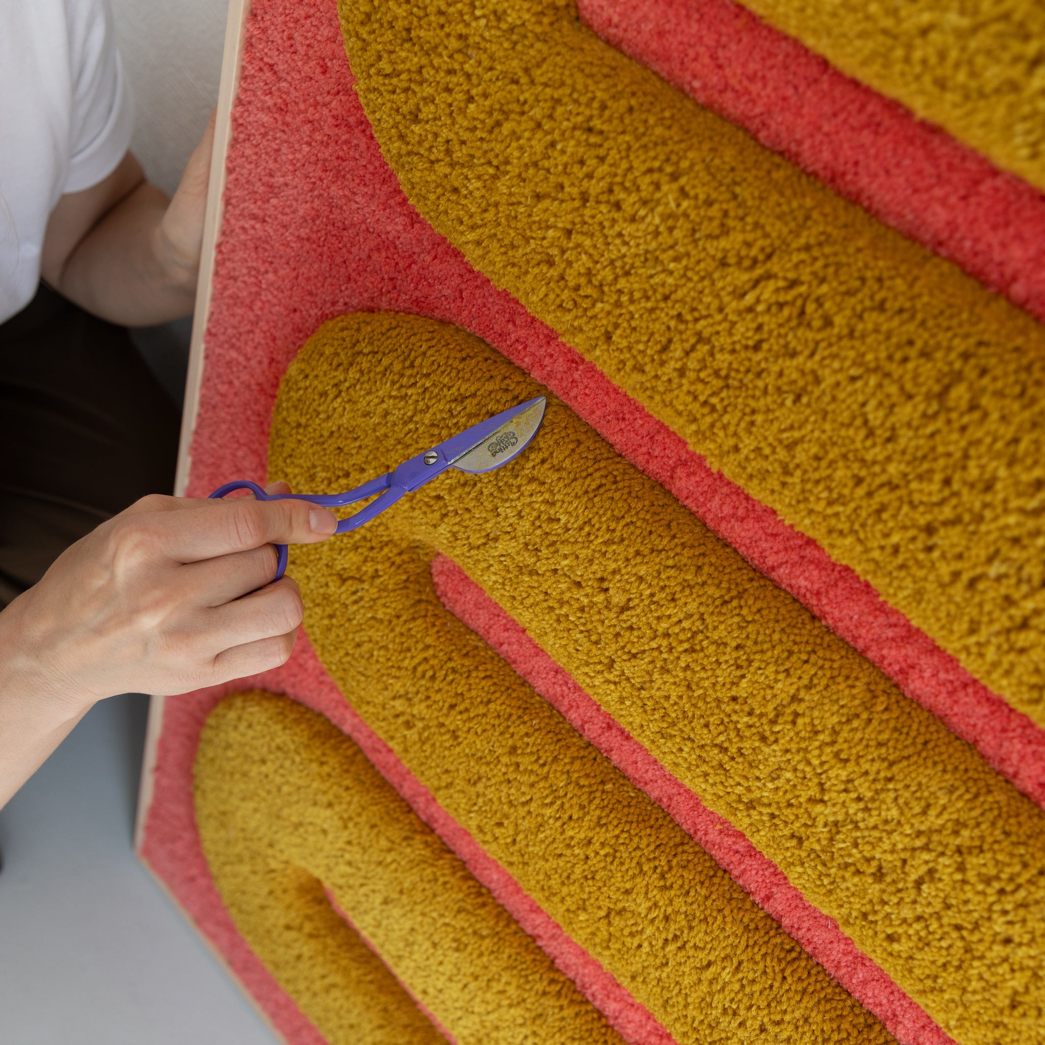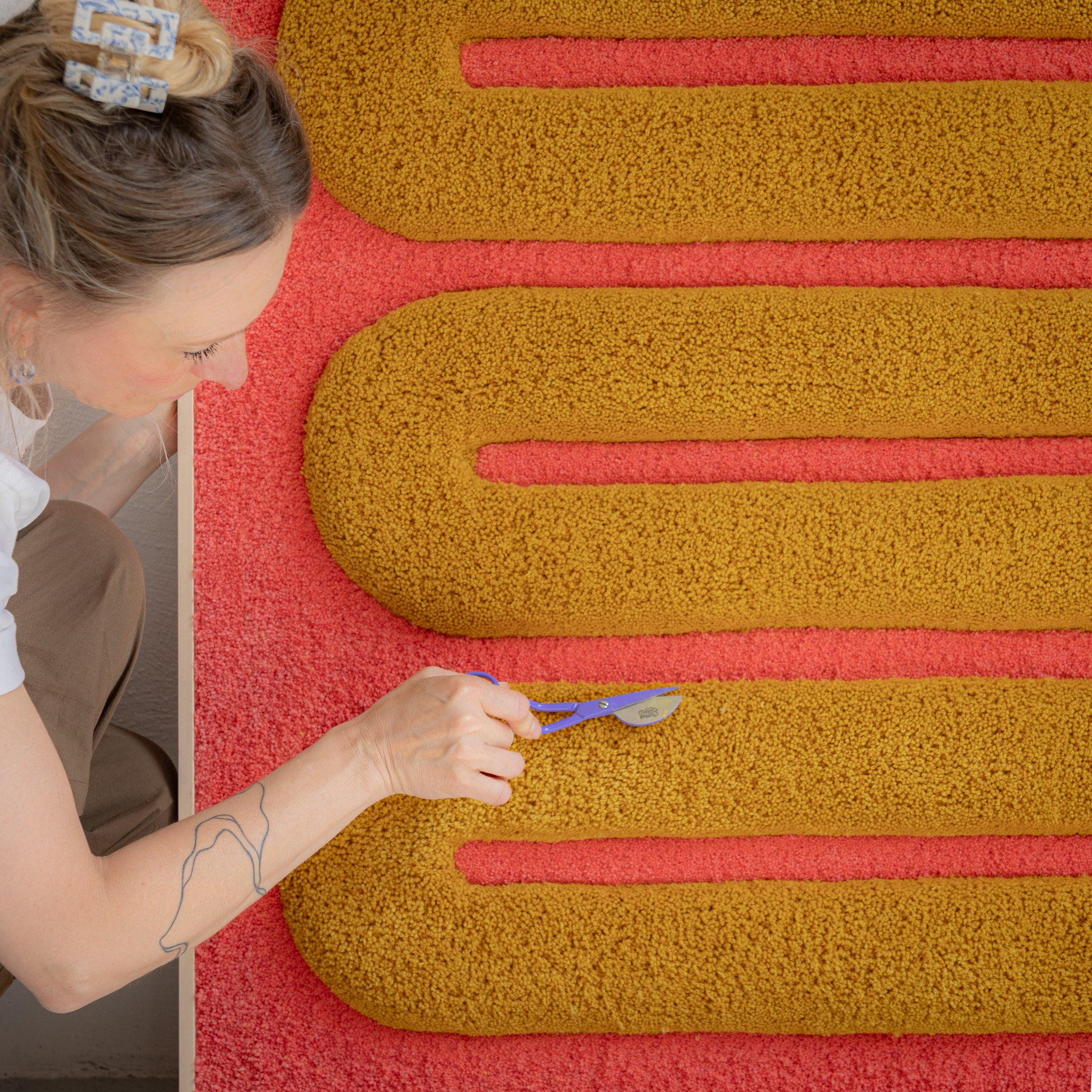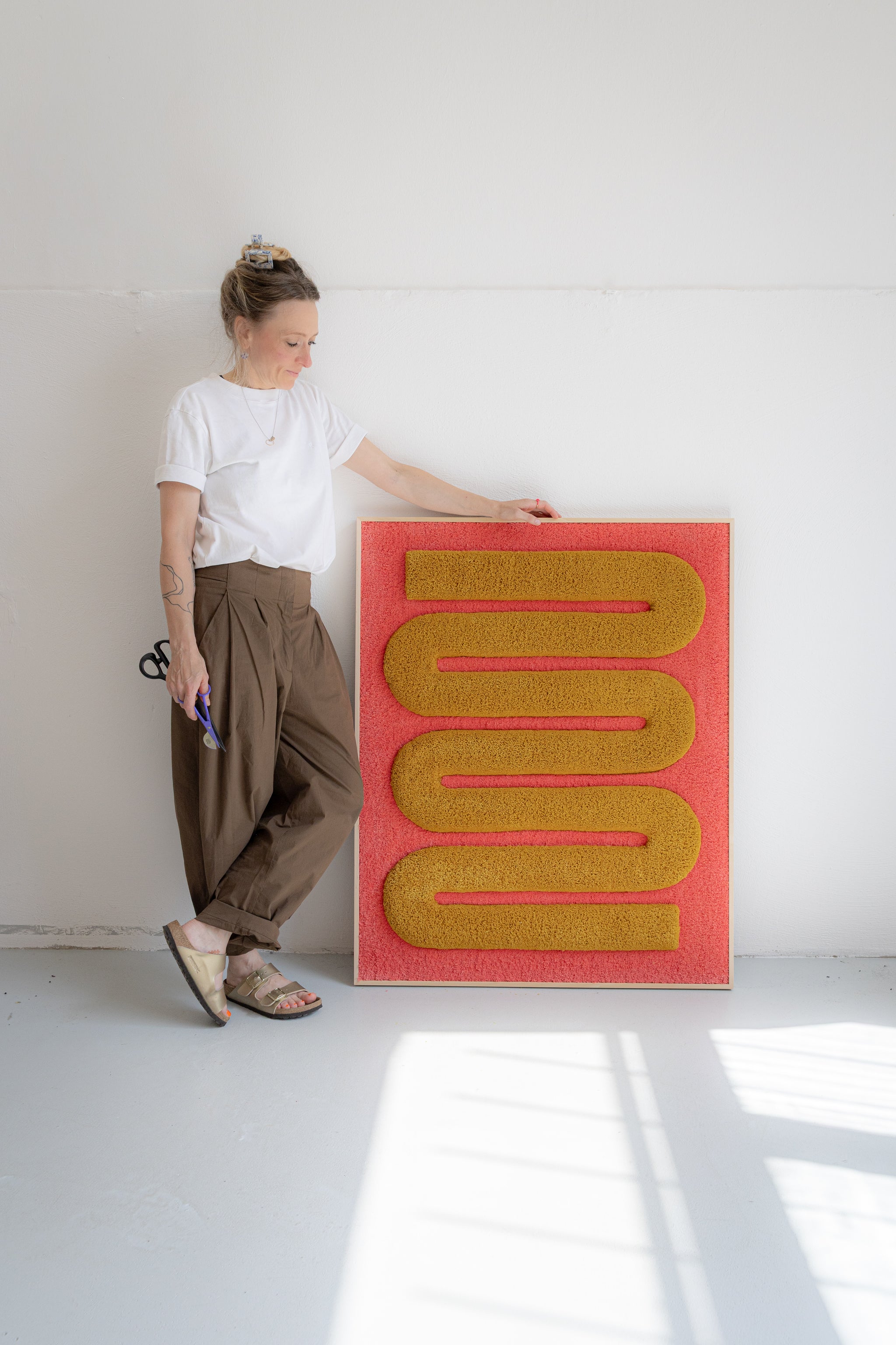 Dieser Wandteppich wird von Hand getuftet. Dies ist eine Technik zur Teppichherstellung. Mit einer speziellen Maschine, namens Tufting Gun, wird das Garn in einen speziellen Gewebestoff/Trägerstoff eingeführt.