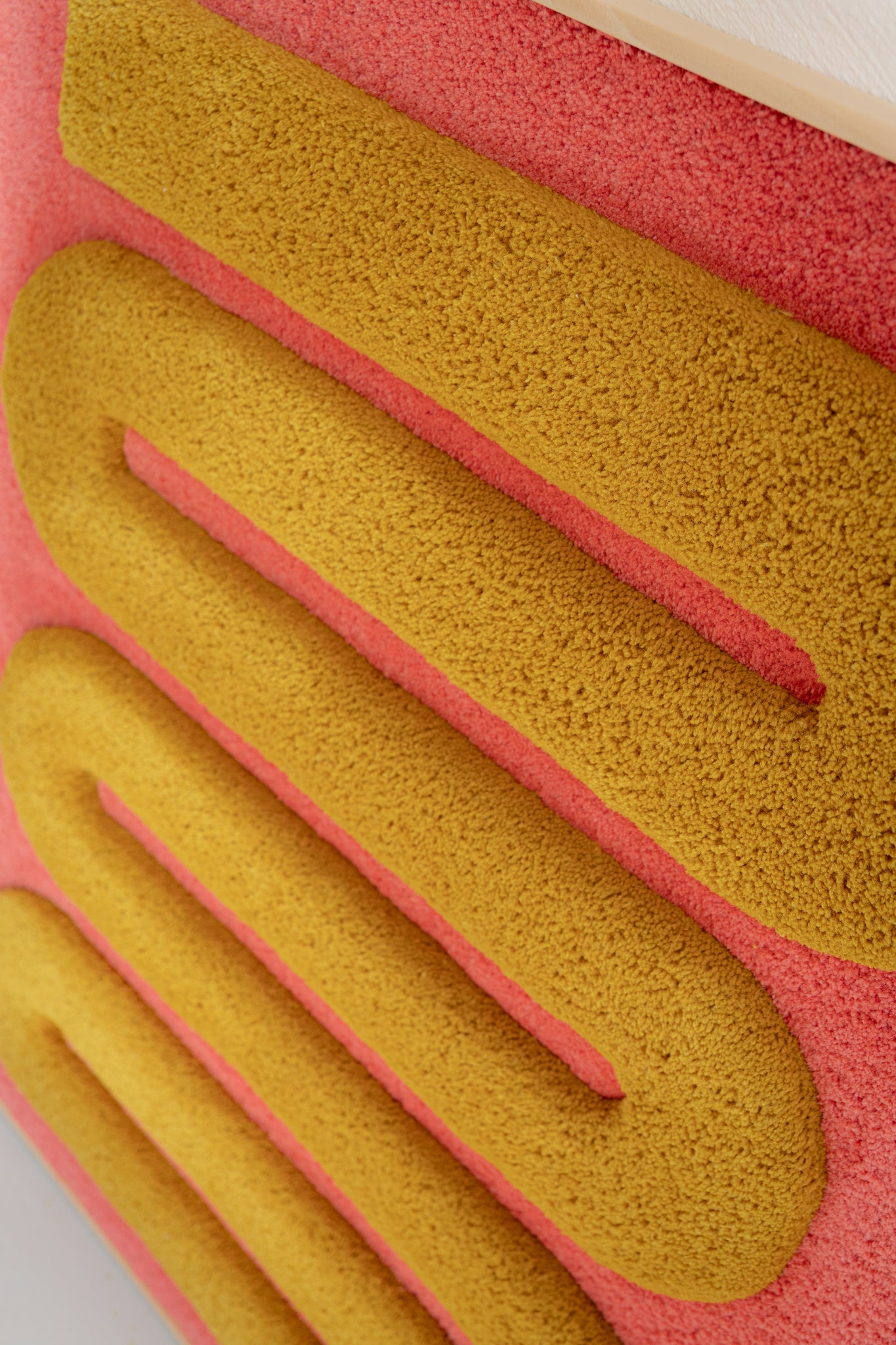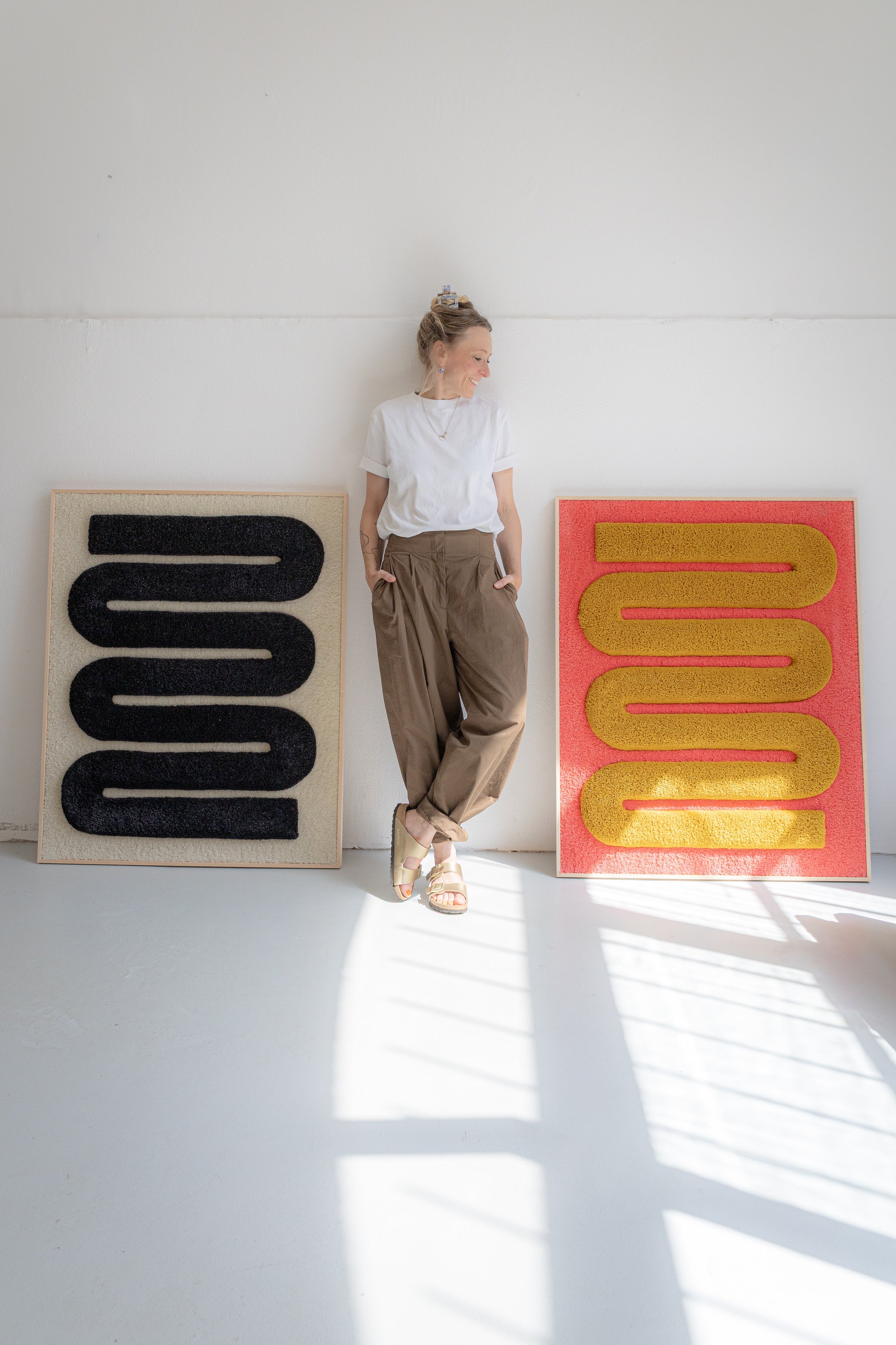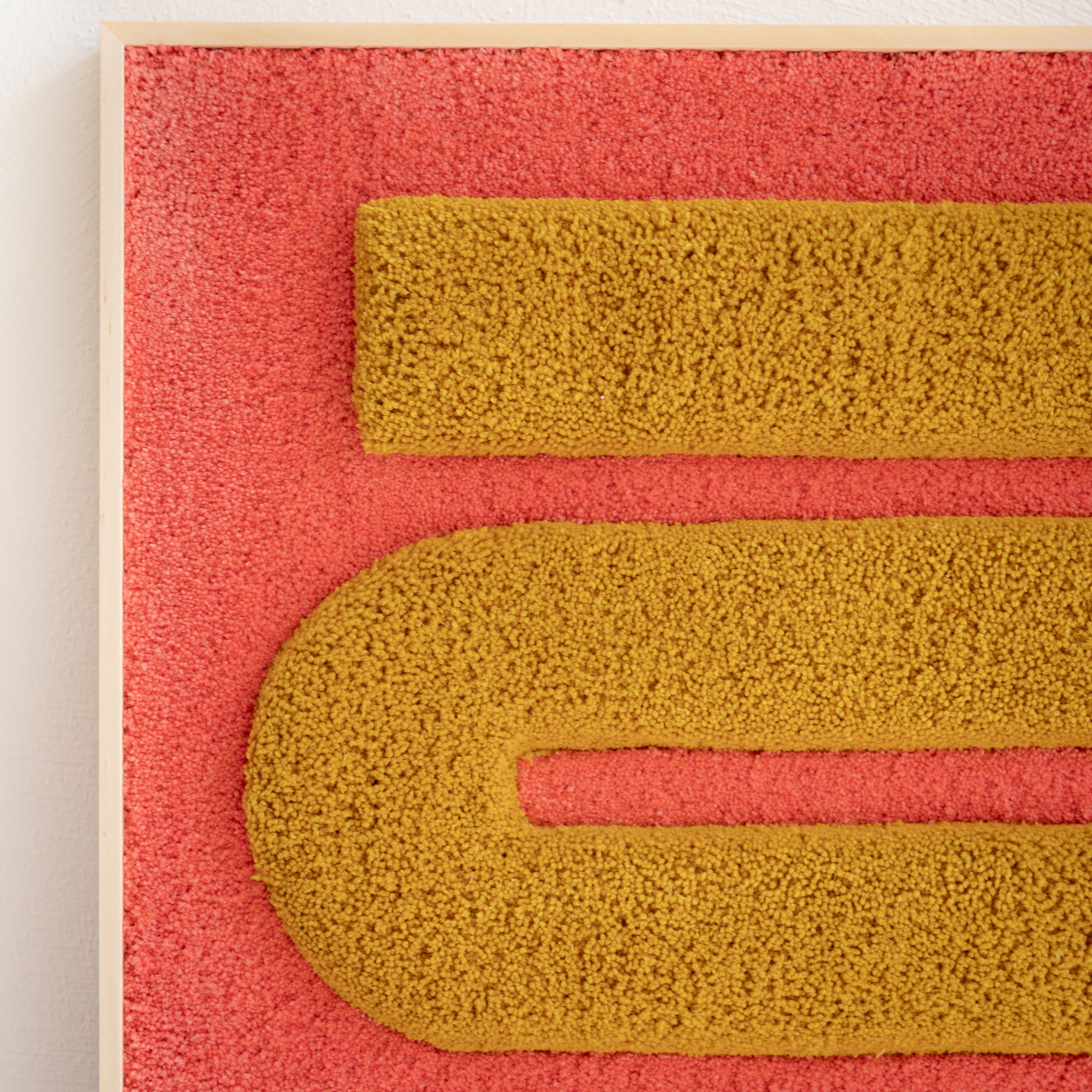 Dieser Wandteppich wird von Hand getuftet. Dies ist eine Technik zur Teppichherstellung. Mit einer speziellen Maschine, namens Tufting Gun, wird das Garn in einen speziellen Gewebestoff/Trägerstoff eingeführt.